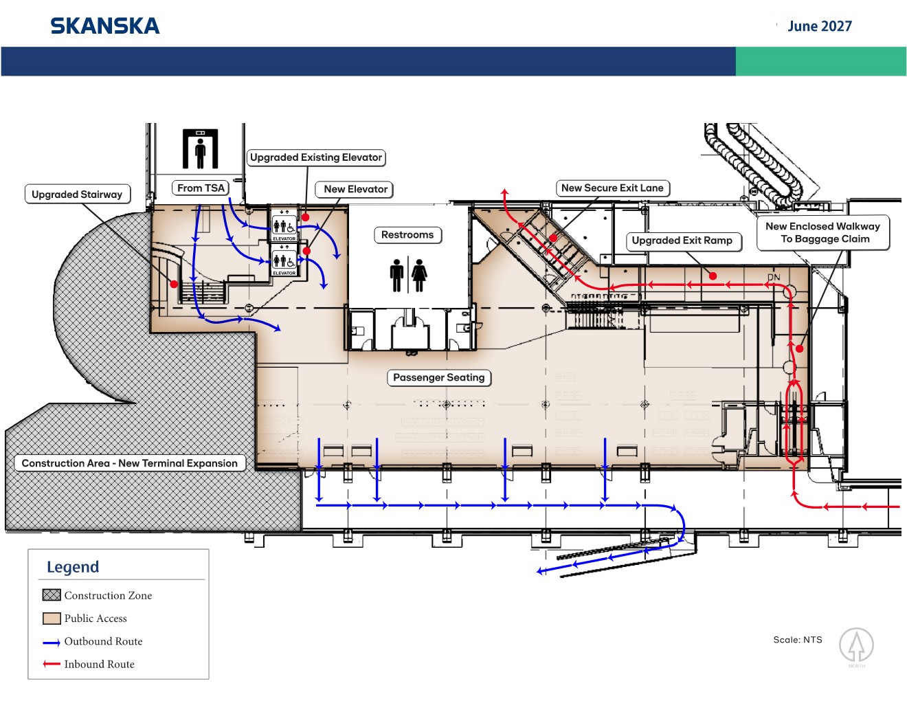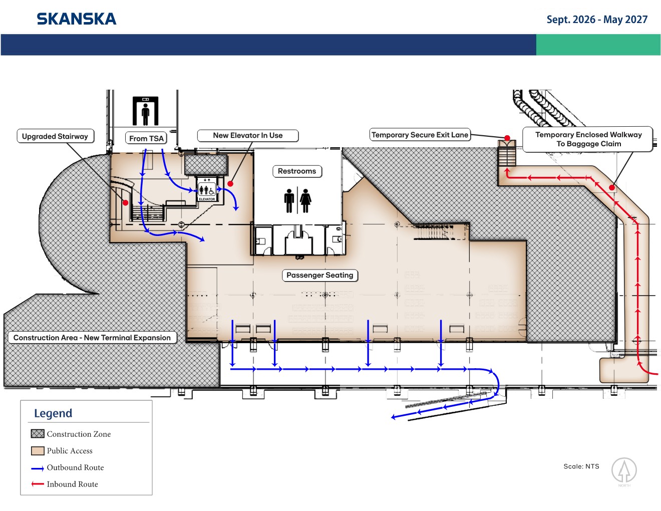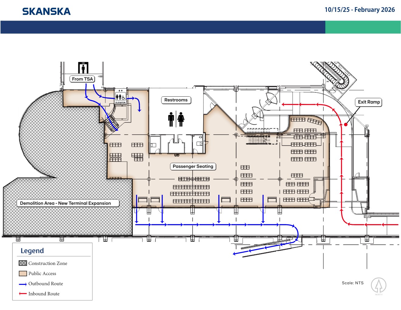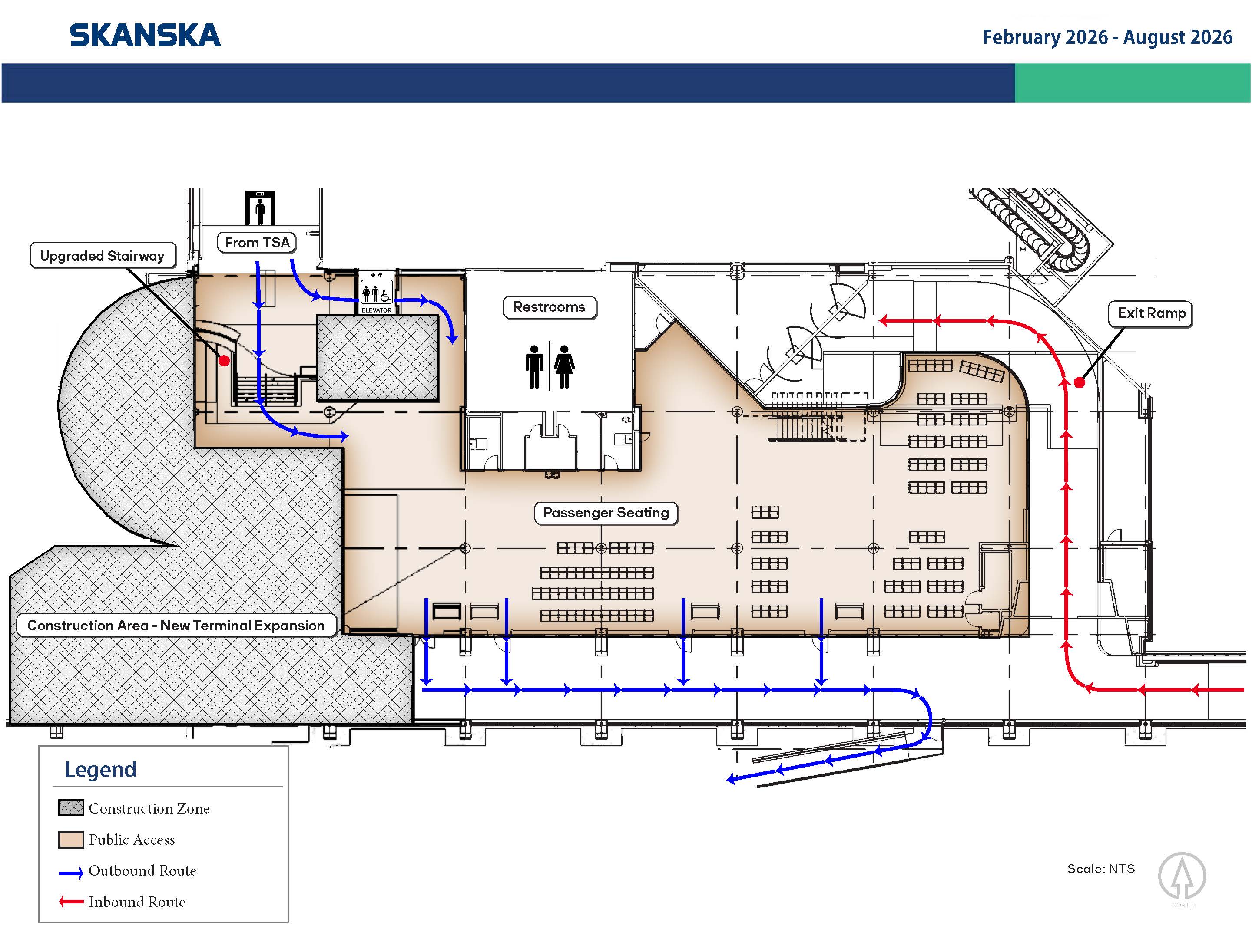 To accommodate construction, the northmost portion of the hold room will be closed off. This work will reconfigure the path to baggage claim. When complete, passengers will benefit from the removal of the rotating doors and the installation of a new double-door system, eventually allowing those deplaning to re-enter the hold room once the expansion project is complete.