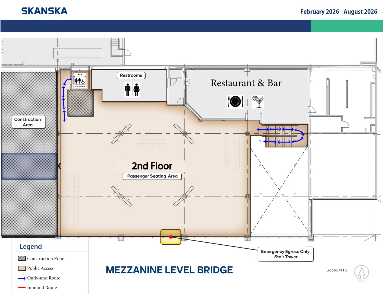 Just past the TSA checkpoint in the recomposure area, construction walls will be erected to allow installation of a new, wider stairway connecting the ground floor to the first floor. This upgrade will improve passenger flow and accessibility.